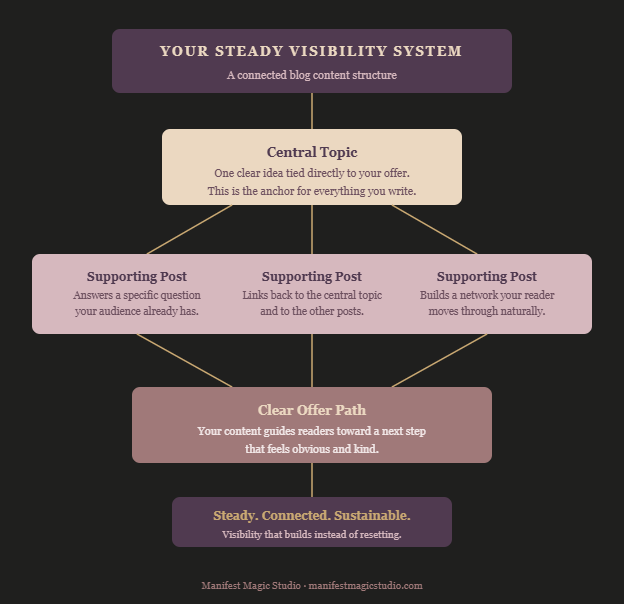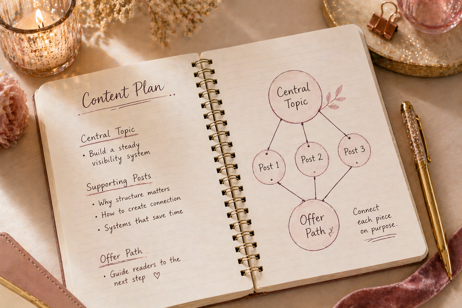 Your blog starts working when your content is structured. A clear system allows each post to support the others, which reduces pressure on you to show up constantly. Staying consistent becomes easier when the structure is in place because you're continuing a system rather than starting from scratch each time.